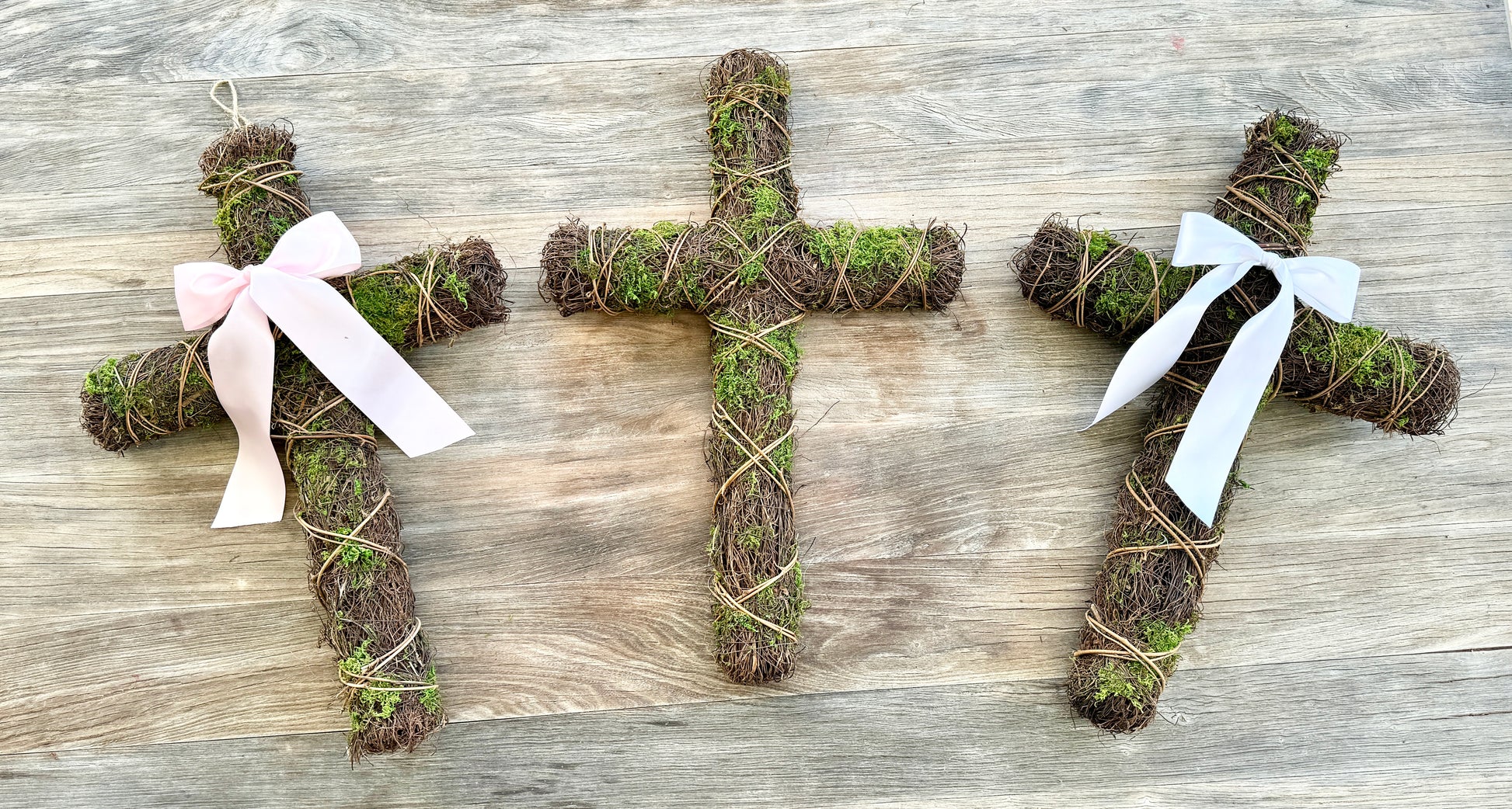 A grapevine and moss cross designed to hang on your front door, offering a warm welcome and a simple expression of faith. Can be purchased with or without a ribbon. COMING SOON!